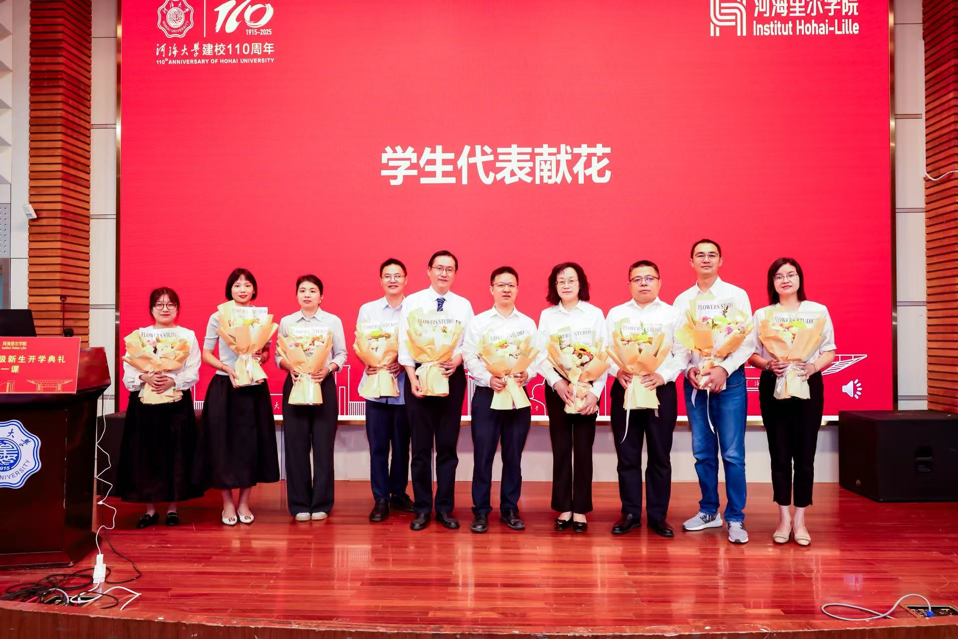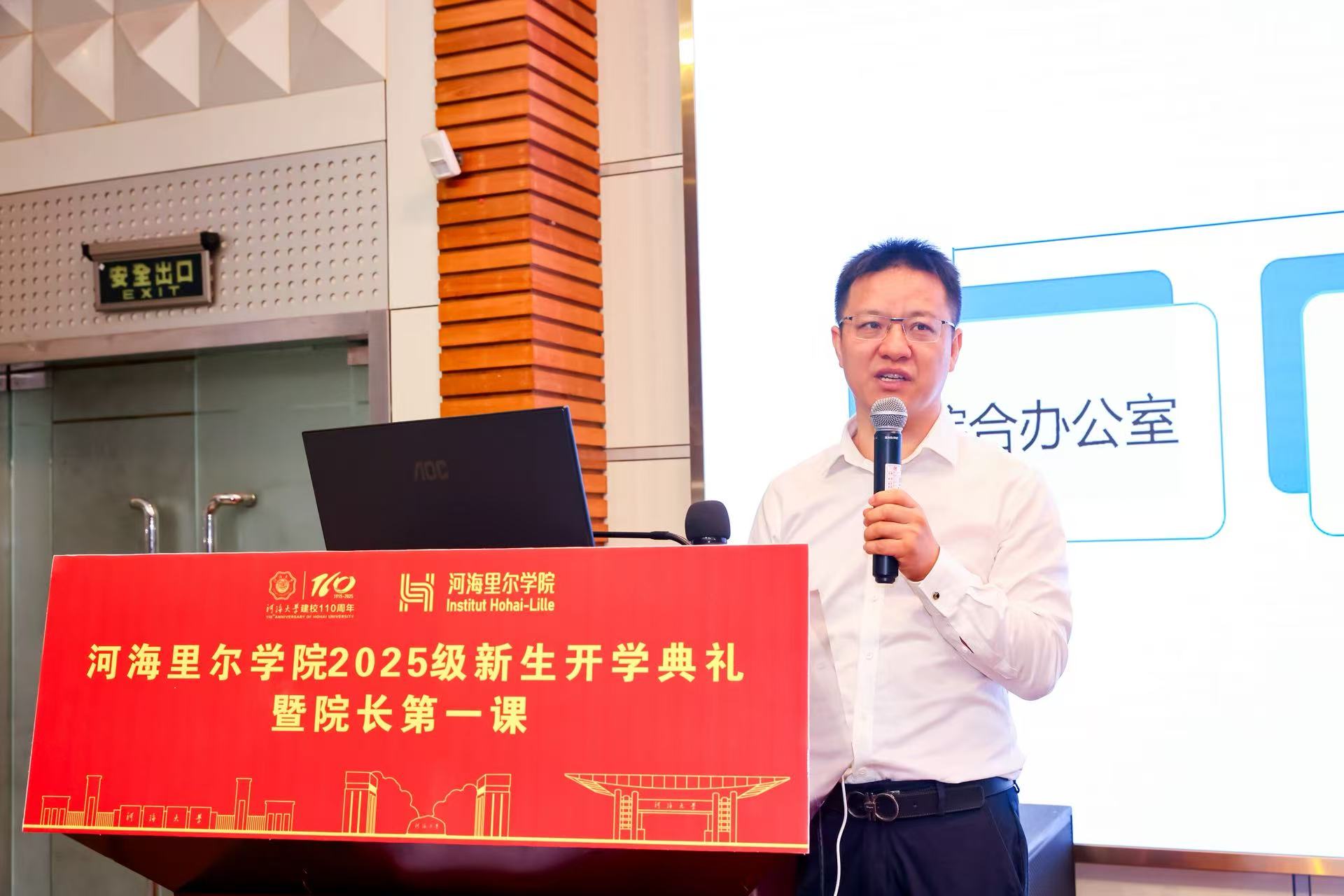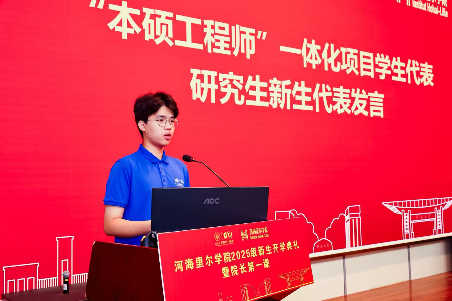 学院“本硕工程师”一体化项目学生代表、研究生新生代表宋浩然同学结合自身在学院从本科到硕士的成长经历,分享了“本硕工程师”一体化培养与赴法交流带来的视野提升。他鼓励本科新生勇敢迎接国际化挑战,并呼吁研究生伙伴深耕学术、保持热爱,共同展现新时代河海里尔人的卓越风采。