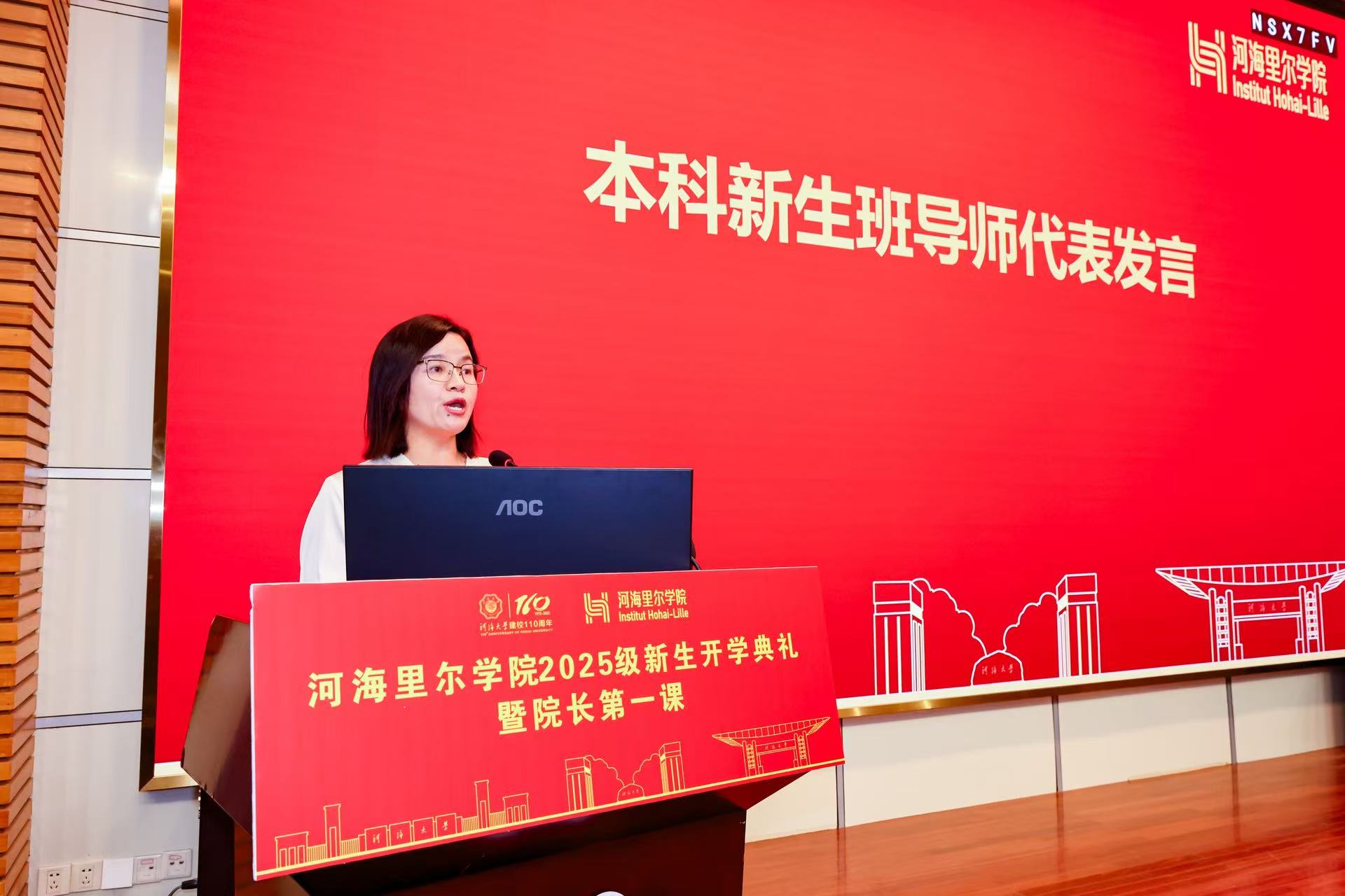 张薇薇老师作为本科新生班导师代表发言,她勉励同学们坚定信念、锤炼品格,在中西汇流的育人环境中拓宽国际视野、夯实专业基础。她承诺全体班导师将恪守使命,做学生成长路上的支持者和引路人,助力每一位同学成为有家国情怀、有过硬本领、有担当精神的新一代河海人!